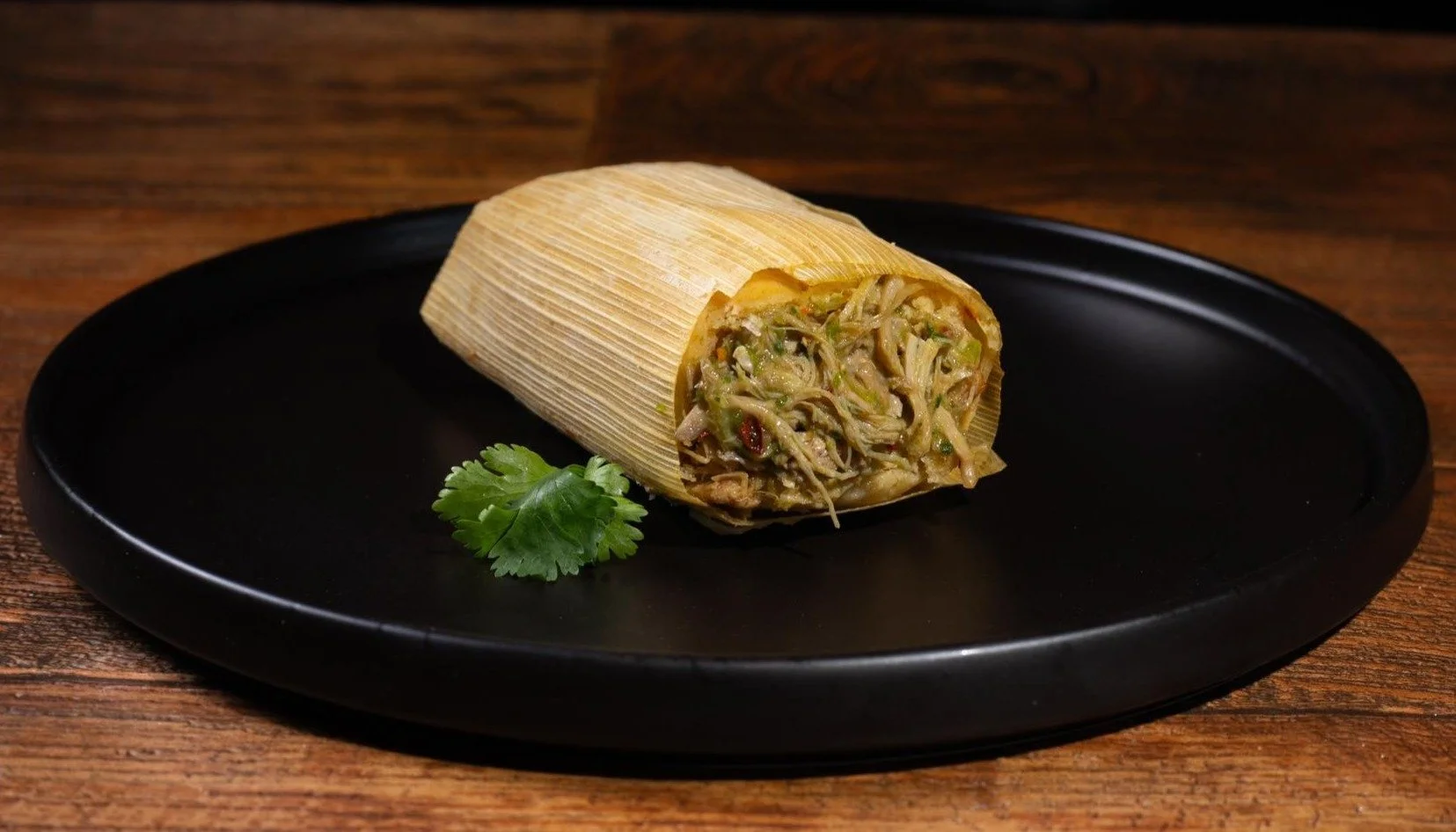 This tamale features moist masa with a mild kick, blended with fresh cilantro and zesty jalapeños. At the center, a rich black bean filling adds depth and flavor. It’s a well-balanced vegan option that’s become a customer favorite.